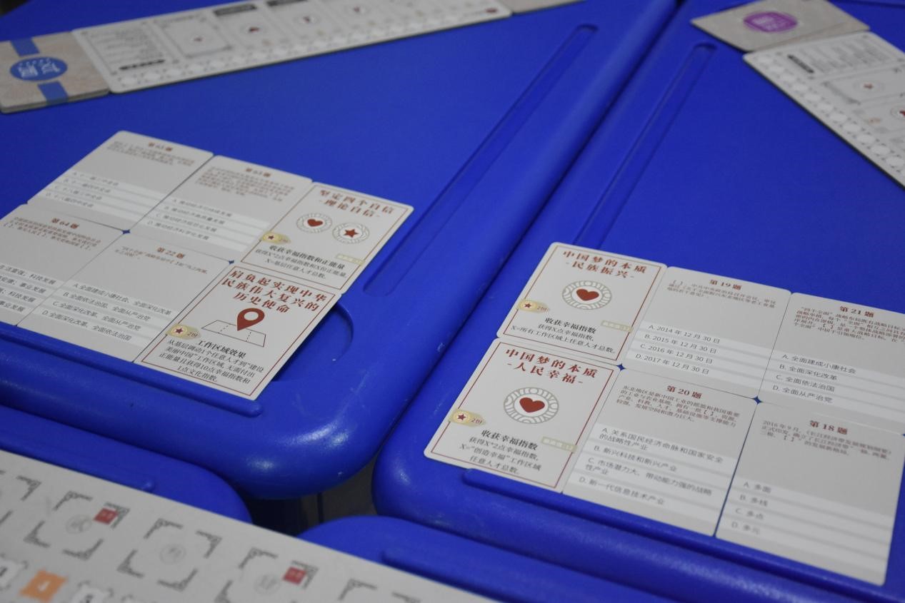 “强国梦”文创桌游共进行六轮,每轮包括五个阶段,按照中国共产党的光辉历程,分别为“新民主主义革命”、“社会主义建设”、“社会主义发展新时期”、“中国特色社会主义”、“改革开放和现代化建设”。比赛巧妙地将游戏各环节主题与党史对应起来,同学们可以通过抢答党史知识的问题,商议拟定发展策略,打出合适的卡牌。不仅要积累知识、提高答题的正确率,而且要考虑策略排布和卡牌次序的合理性,实现寓教于乐。“全面深化改革”、“发展高等教育”、“构建人类命运共同体”、“全面建成小康社会”,这些我党在百年沧桑岁月与风云变迁中所做出的伟大决策,都融汇在这一盘桌游里。欢声笑语中,同学们积极决策、激烈交锋,共同重温了中国共产党百年风雨激荡与壮丽辉煌。