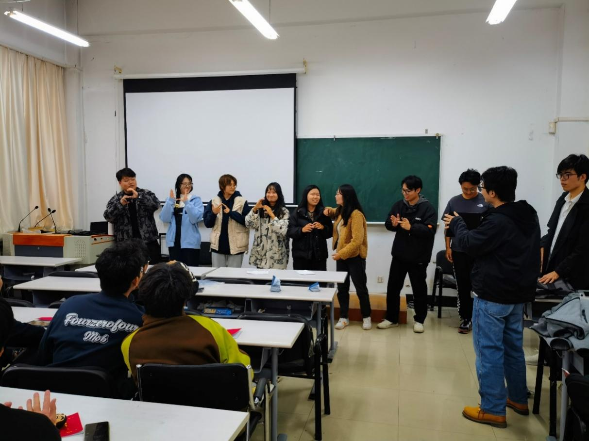 活动首先从“一分钟鼓掌”开始。同学们鼓掌祝贺自己进入研究生阶段,并预期自己一分钟鼓掌的次数,与实际次数相比较,以培养同学们的自我认知和预期能力。接下来是“我知道”活动,同学们分好小组,从相互自我介绍开始,到聊一些互相感兴趣的话题,大家从不陌生到对彼此有了更深的了解。然后是“人体字母”活动,每组同学用身体摆出了LOVE、SUNSHINE等单词,其他组成员轮流猜是什么单词。这个活动不仅锻炼了同学们的团队协作能力,还通过身体语言的方式让同学们更好地理解彼此,增进相互之间的了解和信任。最后是“绘画传递”环节,这个环节由一个团队负责绘画,描绘出一个词语的含义,其他同学则要通过观察和推测来猜测这个词。活动中,绘画者和猜者都表现出了极高的热情和参与度。当猜者成功猜出答案时,他们欢呼雀跃;当答案难以猜测时,他们积极思考,互相讨论。这种积极的互动氛围让整个活动充满了欢乐和活力。