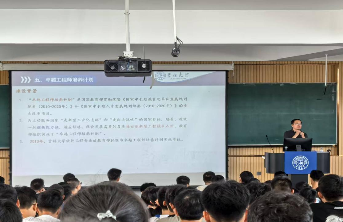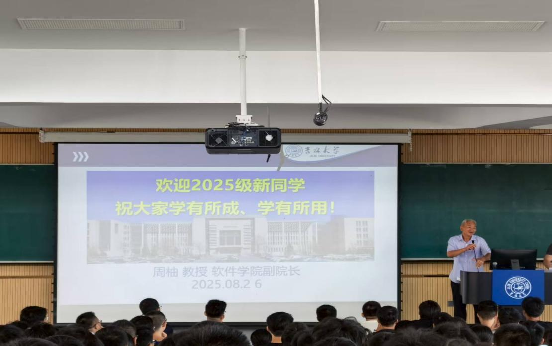 于8月26日在第三教学楼第九阶梯教室举办新生入学教育系列活动第四场——本科生课程培养方案解读。本场讲座由软件学院主管本科教学副院长周柚教授和卓越工程师班思想政治导师柳军老师共同担任主讲,2025级全体本科新生参加。