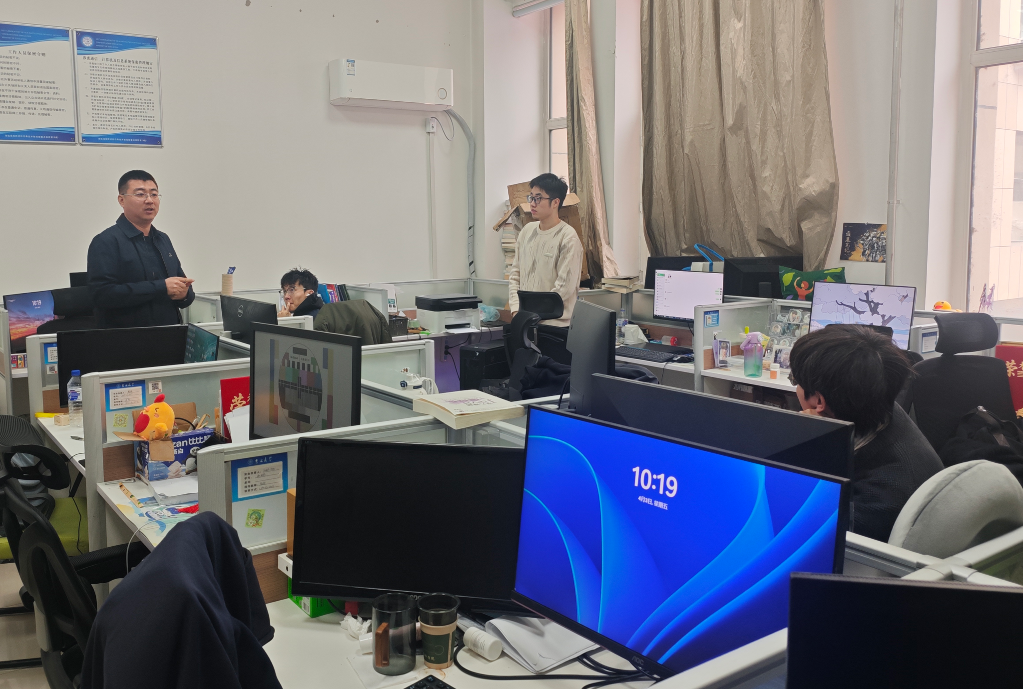 走访过程中,老师们重点对实验室用电安全、设备运行规范、网络信息安全、环境卫生等核心方面开展细致排查。仔细检查了实验室内电脑、服务器、供电线路等是否存在违规使用、老化破损等问题,认真查看实验室门窗关闭、消防设施配备情况,对发现的细小安全隐患现场督促整改,坚决杜绝安全事故发生。在与研究生们交流时,冯书记询问了大家近期的科研进展、项目推进情况以及生活中遇到的难题,耐心倾听同学们的诉求与建议,针对大家在科研攻关、论文撰写、假期安排等方面的困惑,给予针对性的指导与解答。结合清明节传统节日内涵,引导同学们传承红色基因、缅怀革命先烈,树立文明祭祀、绿色祭祀的理念,自觉摒弃陋习,度过一个文明、平安的节日。同时,反复叮嘱同学们假期出行务必注意交通安全、人身财产安全,严格遵守学校假期离校与留校规章制度,留校同学要合理安排科研与休息时间,保持良好的作息,遇到问题第一时间与辅导员、学院老师沟通联系。
