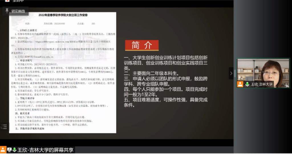 大创项目系列讲座通过腾讯会议直播正式开始。第一场讲座是由计算机科学与技术学院副教授王欣带来的项目交流会。王欣老师从获得课外培养计划学分的主要方法,到参加保研综合面试的切身感受,再到指导大创项目的亲身经历,与同学们深入探讨了大学生做大创项目的意义。做大创项目好比用电钻在平滑的墙面上钻钉子,如果你找到合适的切入点,就可能对你的未来有一个重要的影响。接着,王欣老师与大家分享了组建大创团队以及申请书撰写的注意事项,并用自己申报学校项目举例告诉大家撰写大创项目的申请书很重要,规范申请书格式也同样重要。讲座过程中,有同学就学习吃力是否适合做大创等问题与王欣老师进行了在线沟通。讲座最后,王欣老师希望通过本次讲座,助力同学们的创新创业小舟扬帆起航。