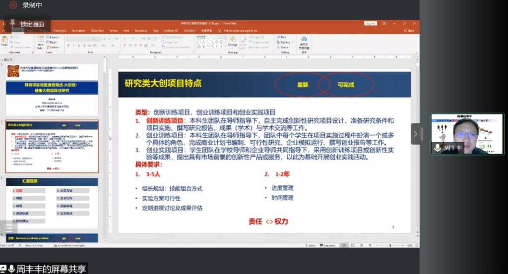 大创项目系列讲座第四场如约而至。计算机科学与技术学院教授、博士生导师周丰丰为同学们带来了以“研究类大创项目全流程规划”为主题的腾讯会议直播讲座。首先,周丰丰老师为大家简要介绍了研究类大创项目的整体规划和时间节点。接下来,周丰丰老师以科研项目选题的可行性为切入点,结合实验室发表文章的实例为同学们详细讲解了论文选题、调研、复现、改进结果、优化算法、论文方案、论文写作、投稿审稿等环节的注意事项。周丰丰老师建议大家在研究工作中培养严谨的工作态度和良好的工作习惯,如遇退稿要认真回复编辑和审稿人的所有意见,如暂离工作要做好文档、论文或实验数据的保存备份,切莫因小失大。最后,周丰丰老师表示良好的开端是成功的一半,希望大家多做研究、多发论文。