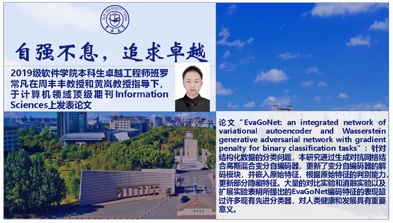本科生邵永康,计算机学院本科生王子涵、胡剑铮、袁佳蔚)在2020年暑假进入2019级卓班班主任周丰丰教授的健康信息实验室开展大数据算法研究。整个暑假以及后面的时间里,该小组都在周教授的指导下刻苦探索相关算法的改进工作,每周不少于三次的组会讨论,超过了不少研究生的科研刻苦程度。该研究成果经历了多个顶会的一轮评审,遗憾被拒。但是该小组成员坚持不懈,反复修改完善,最终见证了该篇论文“EvaGoNet: an integrated network of variational autoencoder and Wasserstein generative adversarial network with gradient penalty for binary classification tasks”在计算机领域顶级期刊Information Sciences上发表。该工作还受到黄岚教授的悉心指导。2019级卓班在全班同学的努力下,荣获绅士仓库