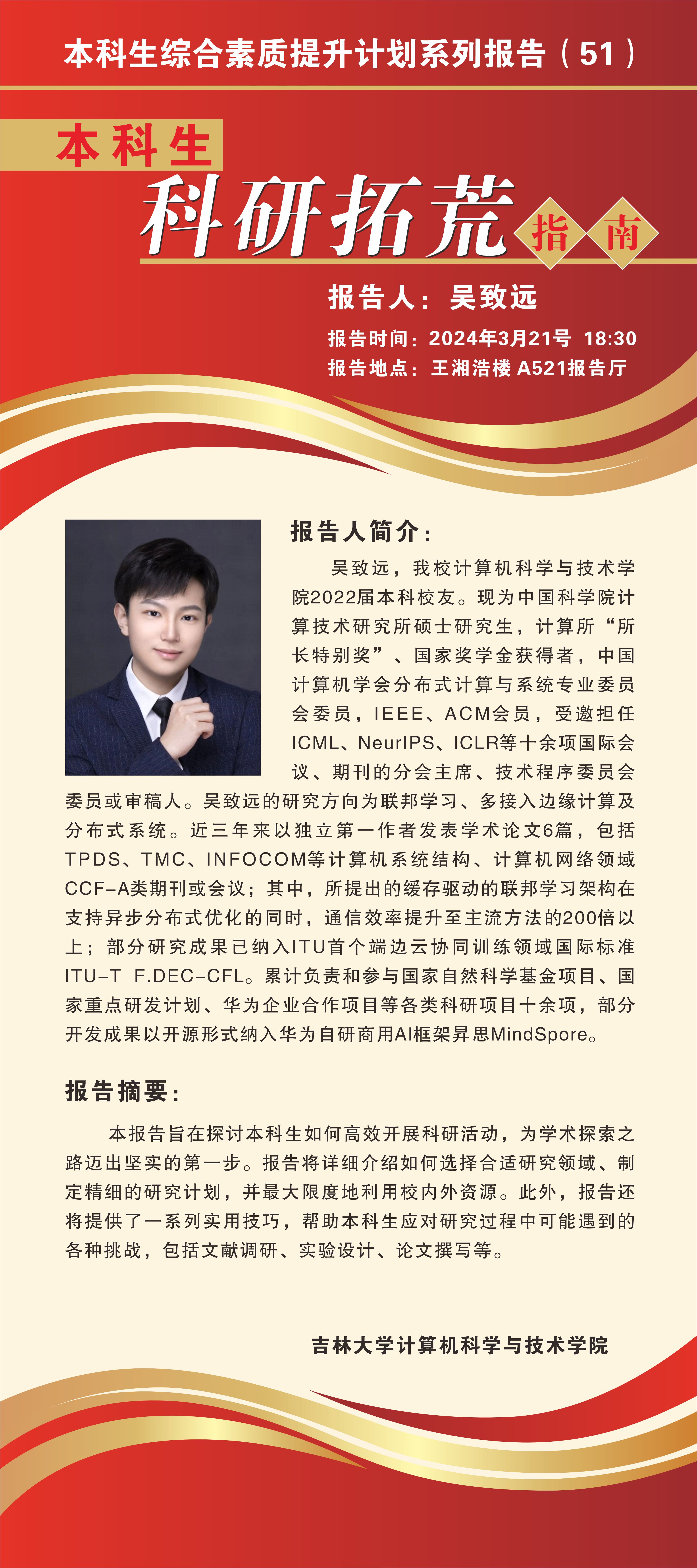报告人简介:吴致远,我校计算机科学与技术学院2022届本科校友。现为中国科学院计算技术研究所硕士研究生,计算所“所长特别奖”、国家奖学金获得者,中国计算机学会分布式计算与系统专业委员会委员,IEEE、ACM会员,受邀担任ICML、NeurIPS、ICLR等十余项国际会议、期刊的分会主席、技术程序委员会委员或审稿人。吴致远的研究方向为联邦学习、多接入边缘计算及分布式系统。近三年来以独立第一作者发表学术论文6篇,包括TPDS、TMC、INFOCOM等计算机系统结构、计算机网络领域CCF-A类期刊或会议;其中,所提出的缓存驱动的联邦学习架构在支持异步分布式优化的同时,通信效率提升至主流方法的200倍以上;部分研究成果已纳入ITU首个端边云协同训练领域国际标准ITU-T F.DEC-CFL。累计负责和参与国家自然科学基金项目、国家重点研发计划、华为企业合作项目等各类科研项目十余项,部分开发成果以开源形式纳入华为自研商用AI框架昇思MindSpore。
